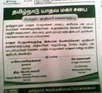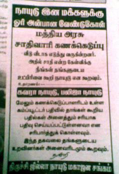 அவரவர் ஜாதிகளில் எண்ணிக்கையைக் கூட்டிக்காட்டுவதற்குத்தான் இந்த அறிவிப்புகள். அடுத்தபடியாக, இது அதிகாரப்பூர்வமாக அறிவிக்கப்படும்போது, பெரும்பான்மை ஜாதி எதுவோ அவர்தான் தமிழ்நாட்டை ஆளவேண்டும் என்று குரல் எழும்பக்கூடிய வாய்ப்பிருக்கிறது!!