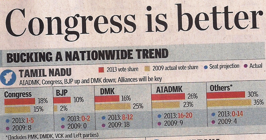 பணம் கொடுத்தால் ஊடகங்கள் தமக்குத் தாமே கருத்துக் கணிப்புக்கள் எழுதி வெளியிடும் மோசமான சூழ்நிலை தான் ஏற்பட்டுள்ளது. 15 % வாக்கு வங்கி இருந்தால் காங்கிரஸ் தனித்துப் போட்டியிட்டு 16 % வாக்கு வங்கியுள்ள திமுகவின் அளவுக்கு தொகுதிகளைப் பெறுமா? எ