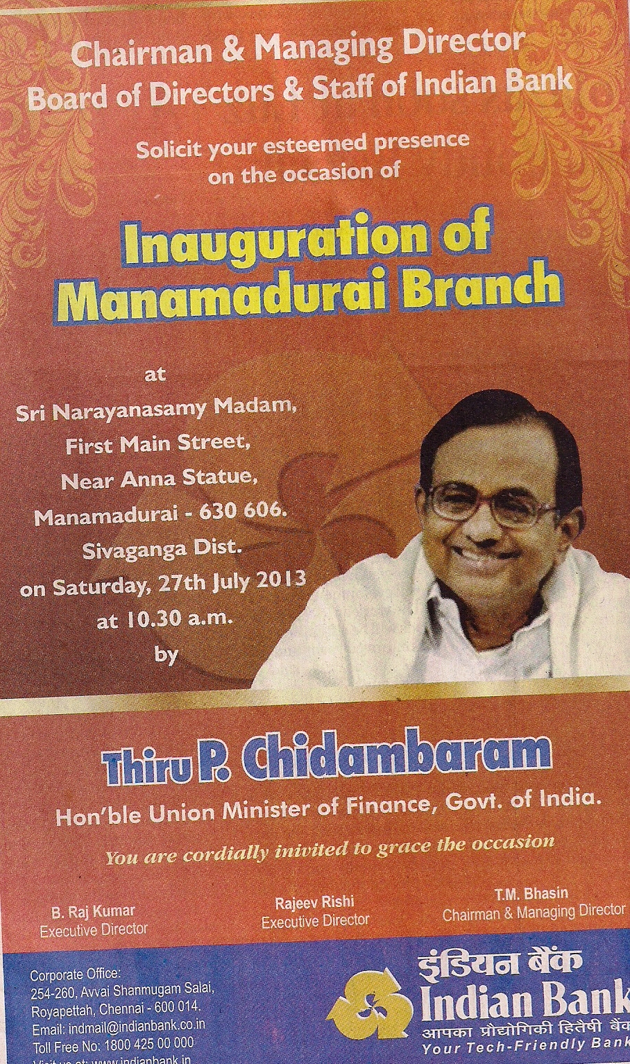 மேற்படி சிவகங்கை வங்கிக்கிளை திறப்பு விழாவில்