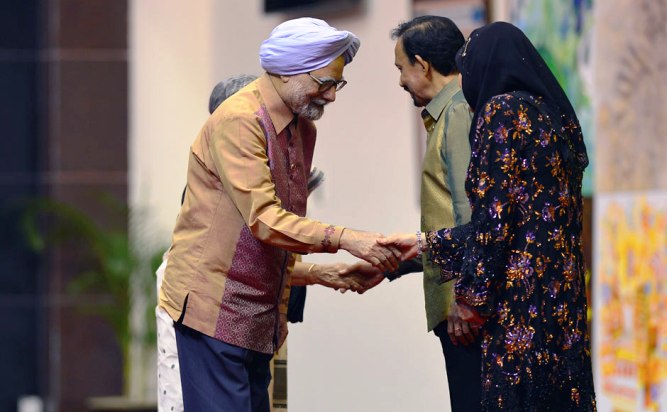 That is the ASEAN tradition. Every visiting head of state even the Chinese, US premiers wear such exotic costume of the host nation. India being trading partner and had been invited for this conference, i don’t see anything wrong in his costume. But it is just about that. It is not an endorsement of மண்ணு மோகன் சிங்.