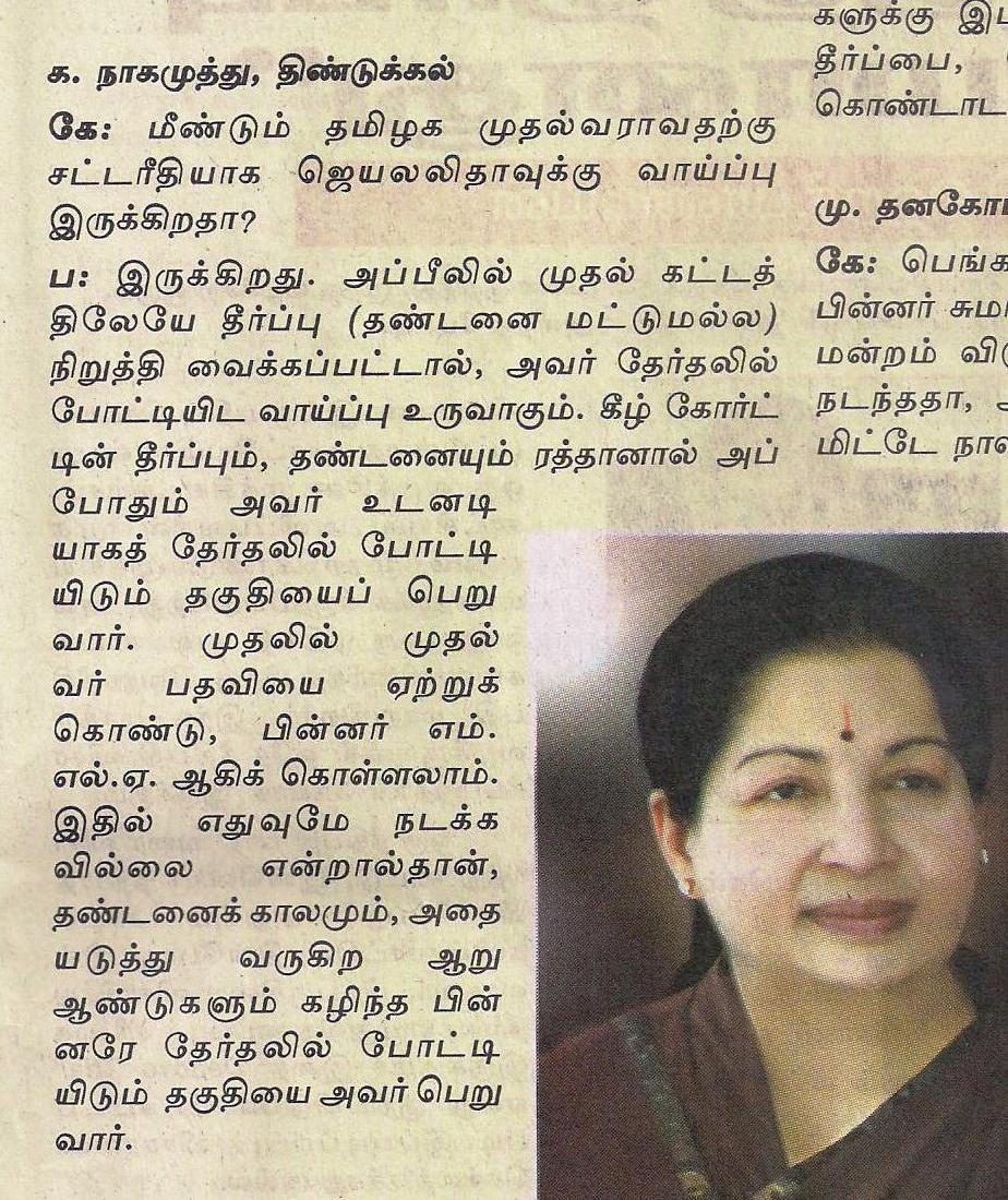 இதில் ஜெ தவறு செய்தாரா இல்லையா என்பதை விவாதிக்கவே இல்லை. தவறு செய்தவர் என்று குற்றம் சாட்டப் பட்டவர், குற்றம் நிரூபிக்கப் பட்டது என்று கீழ் கோர்ட்டில் தீர்ப்பளிக்கப் பட்டவர், எந்த உரிமையும் இல்லாதவரா? இந்த வழக்கில் ஜெ வை மறந்து வேறு யாரையாவது நினைத்துக் கொள்ளுங்கள்.. அவருக்கும் இதே வாதங்கள் பொருந்தும்.