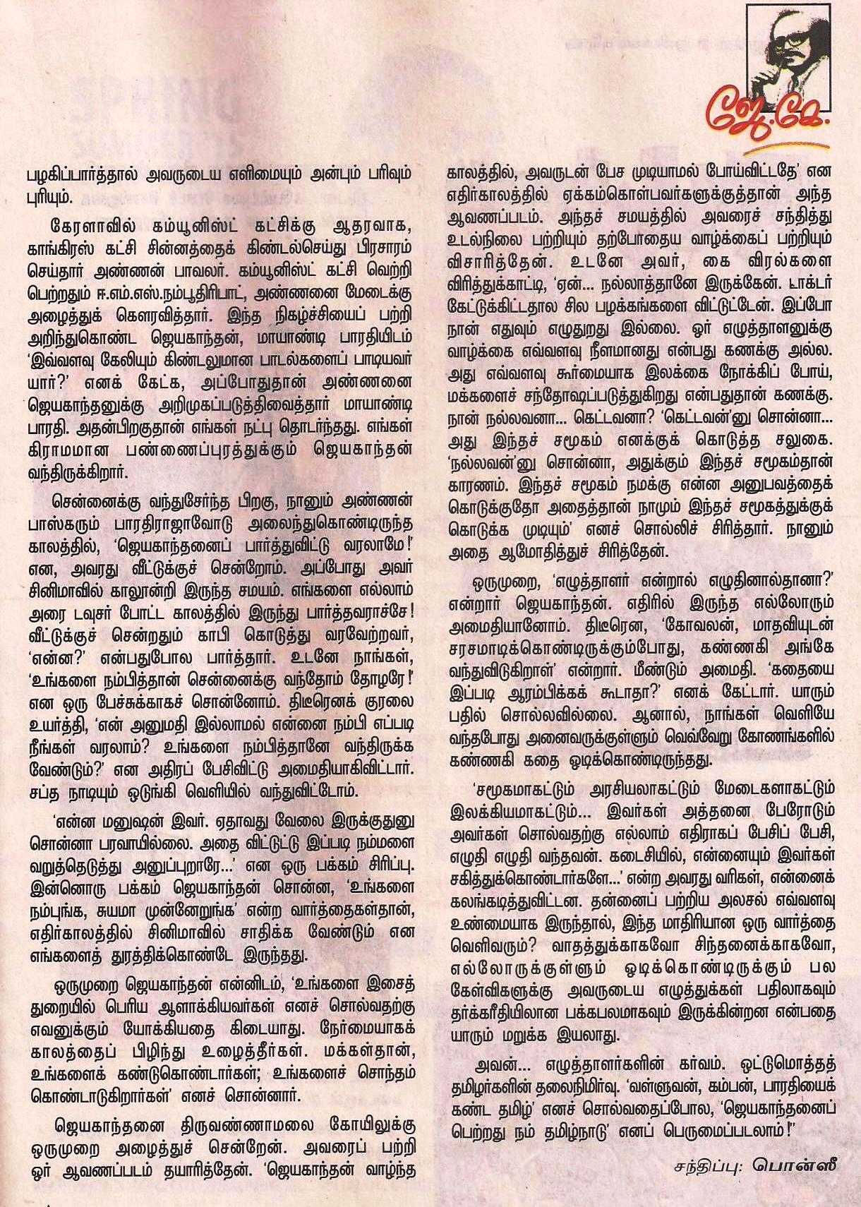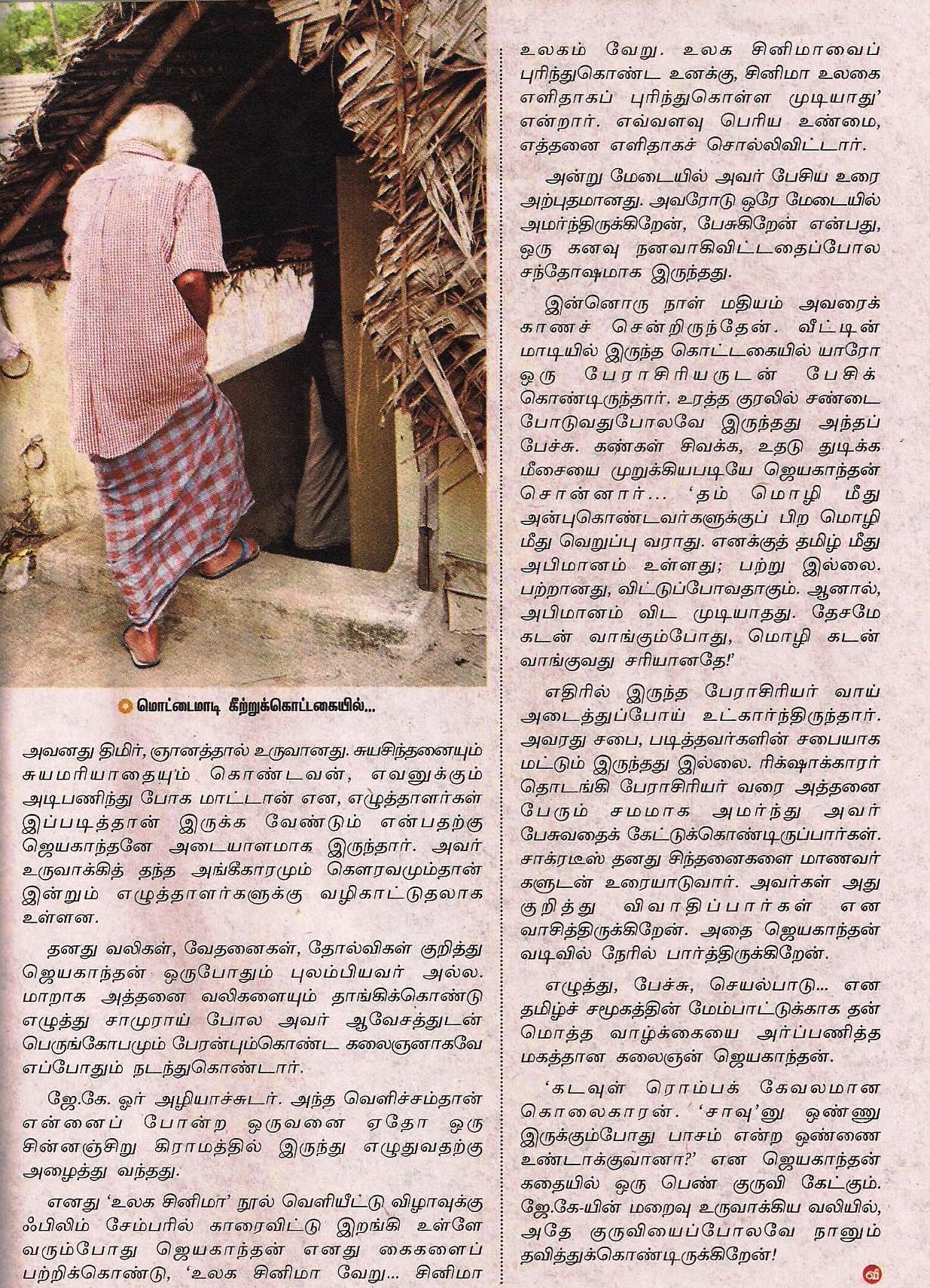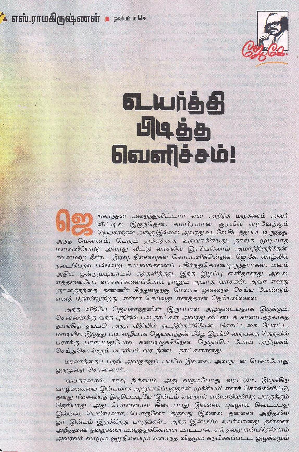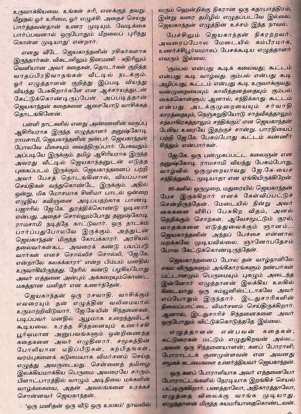 Dear KM, this article makes very interesting read. Think of JK, we can visualize an ever-roaring lion among writers! In my early twenties, I recall reading one of his stories, “Gokila Enna Seidhu Vittal?” in Ananda Vikatan. The story made such an impact on my mind that on finishing it, I couldn’t resist penning a letter to the Editor, Ananda Vikatan, highlighting what all that I appealed to me in the said story. It is said that whatever or whoever that impresses us in our teenage/early twenties would forever remain green in our memory.