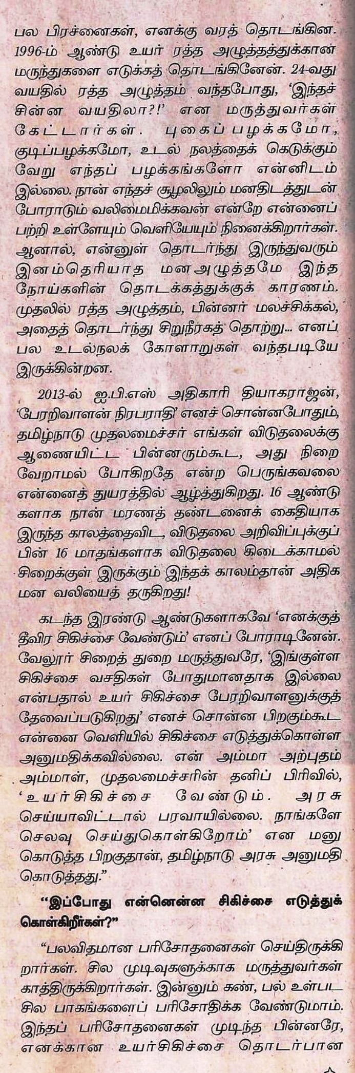 மேலும் தியாகராசன் X- ஐபீஎஸ், பேரறிவாளன் நிரபராதி என சொல்லவில்லை, ஆனால் பேரறிவாளன் தான் வாங்கி கொடுத்த பாட்டரி குண்டில் பயன்படுத்தப்படும் என்ற விபரம் தனக்கு தெரியாது என்று கொடுத்த வாக்கு மூலத்தை கோர்டில் தெரிவிக்காமல், அவருக்கு தெரிந்துதான் செய்தார் என பொய் சொன்னதாக இந்த X- ஐபீஎஸ் ஒத்துக்கொண்டார். இந்த பொய்யால் தான் பேரறிவாளனுக்கு தூக்கி தண்டனை வழங்கபட்டது. இந்த அதிகாரி மீது இதுவரை எந்த நடவடிக்கையும் இல்லை என்பதுதான் நமது அரசு-நீதி துறையின் லட்சணம்!!!