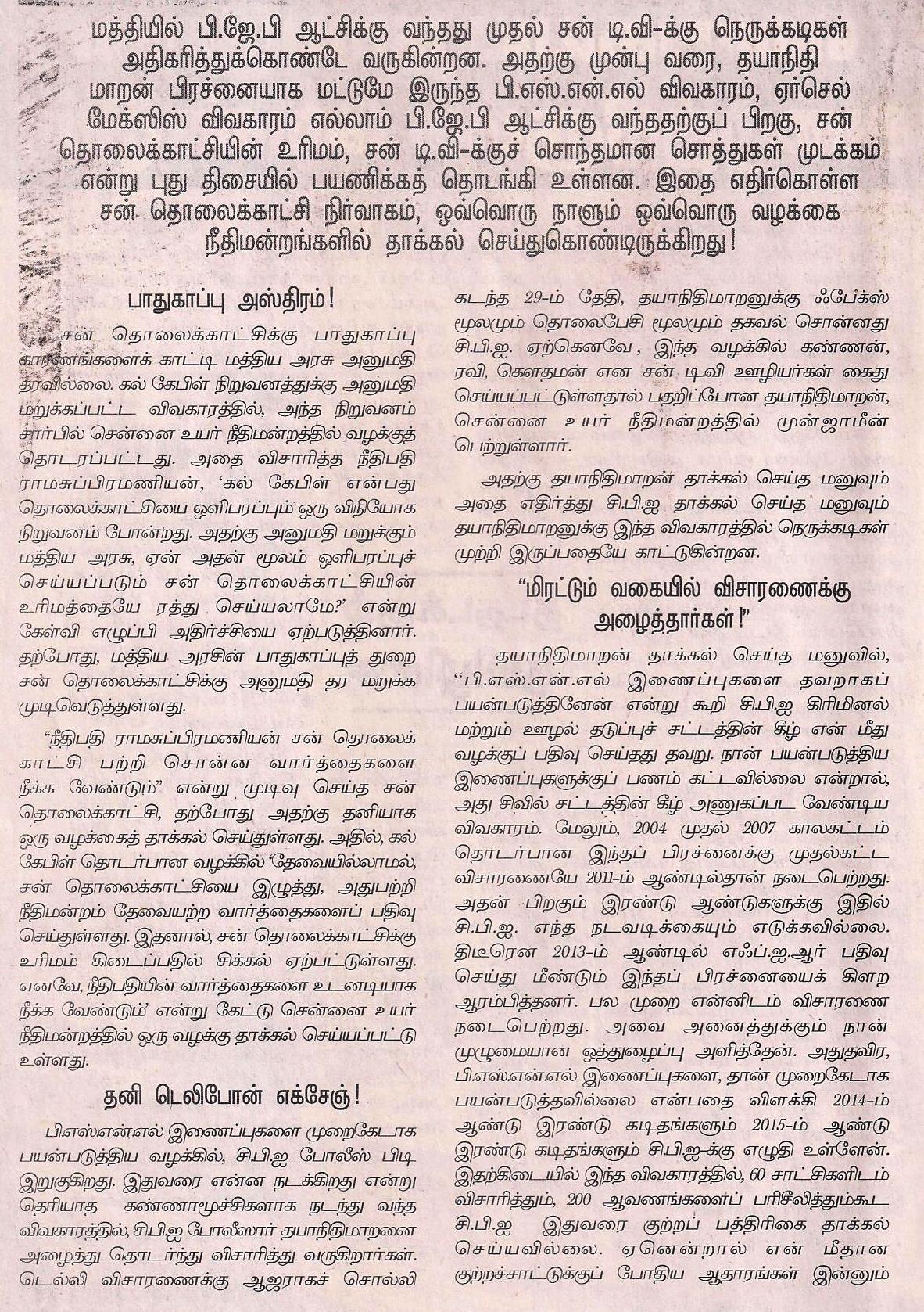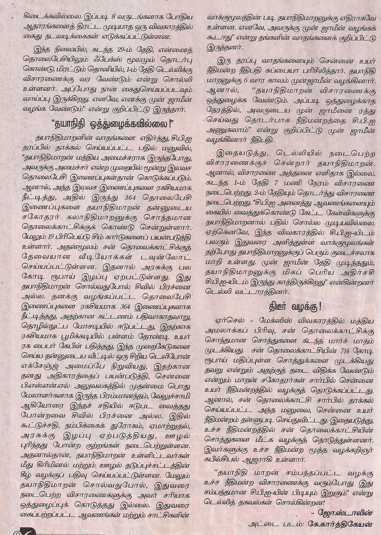 திரு.தயாநிதி மாறன் மற்றும் அவரது சகோதரர் திரு.கலாநிதி மாறன் ஆகியோர் சம்பந்தப்பட்ட சிபிஐ வழக்கு குறித்து இன்று ஜூனியர் விகடன் இதழில் வெளியாகியுள்ள
