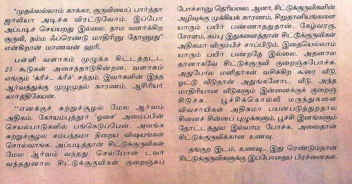 அதிலிருந்து இன்று வரையும் கூட்டைக் கலைத்தால் பாவம் என்ற அர்த்தம் மட்டும் மனதில் நன்கு பதிந்து விட்டிருக்கிறது…….’சிட்டுக்குருவி, சிட்டுக்குருவி சேதி தெரியுமா’…, ‘சிட்டுக்குருவிக்கென்ன கட்டுப்பாடு’… என்ற பாடல்களை கூட அதிகம் கேட்க முடிவதில்லை ….. ஒவ்வொரு ஆண்டும் மார்ச் 20 — ம் நாள் சிட்டுக்குருவிகள் தினம் என்று அரசு அறிவித்துள்ள அன்றாவது ” சிட்டுக்குருவிகளை ” நினைவு கூர்ந்து ஒரே ஒரு கூடு அமைக்க முயலுங்கள் …. சிட்டுக்குருவிகளுக்கு ” வீட்டுக் குருவிகள், அடைக்கலக் குருவிகள், ஊர்க் குருவிகள் ” என்கின்ற வேறு பெயர்களும் நம் தமிழ்நாட்டில் உண்டு …. மீண்டும் ” கீச், கீச் என்ற இனிமையான ” சத்தம் கேட்க வேண்டுமல்லவா ….?