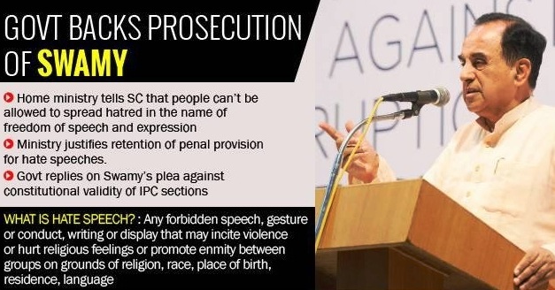 இந்த நிலையில் உச்சநீதிமன்றத்தில் “வெறுப்பைத் தூண்டும் பேச்சு”க்கு தண்டனை வழங்கக் கூடிய ஐ.பி.சி. சட்டப் பிரிவுகளுக்கு எதிராக சுப்பிரமணியன் சுவாமி மனு ஒன்றைத் தாக்கல் செய்தார்.