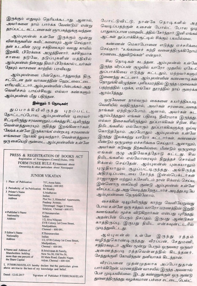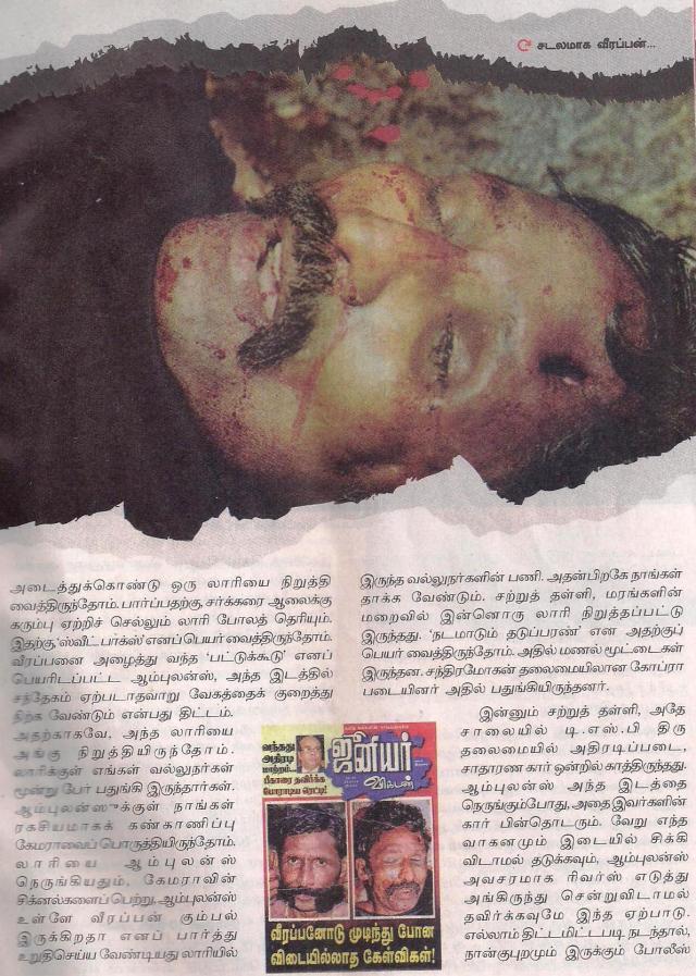 1. நக்கீரன் கோபால், தான் வீரப்பனைப் பார்த்து அதைப் பற்றிய தொடர் எழுத ஆரம்பித்ததனால் நக்கீரன் சர்க்குலேஷன் அதிகமாவதைப் பார்த்து, ஜூ.வியும் தானும் ஒரு தொடர்-“கதை”யை வீரப்பனைப் பற்றி எழுதியது. (தானே அறிந்துகொண்டதுபோல)