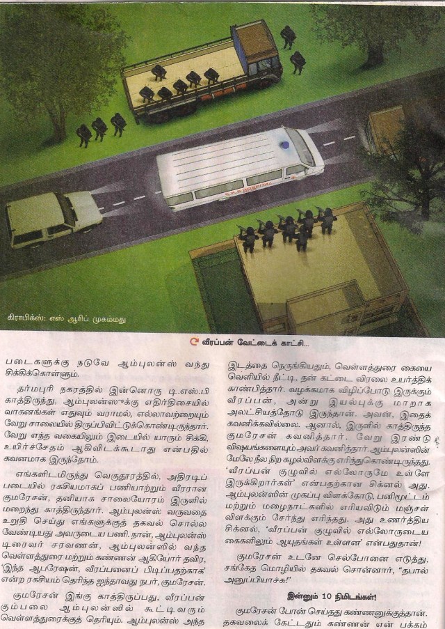 Read more at: http://tamil.oneindia.com/news/tamilnadu/vijayakumar-launch-book-veerappan-chasing-the-brigand-274733.html இந்த செய்தியில் இன்னும் பல ” சுவாரஸ்யங்கள் ” இருக்கின்றன … ஜாதகமும் கைகொடுத்துள்ளது ஒரு வியப்பு … அதைவிட அழுத தன் சொந்த குழந்தையை கொன்றவன் வீரப்பன் என்பது — அவனுடைய குணம் எத்தகையது என்பதை காட்டுவதாக உள்ளது …. ” ஆபரேசன் பட்டாம்பூச்சி கூடு ” வீரப்பனின் வீழ்ச்சி மட்டுமல்ல — பலரின் நிரந்தர – தொடர் வருமானத்திற்கும் வைத்த ஆப்பு … !!!