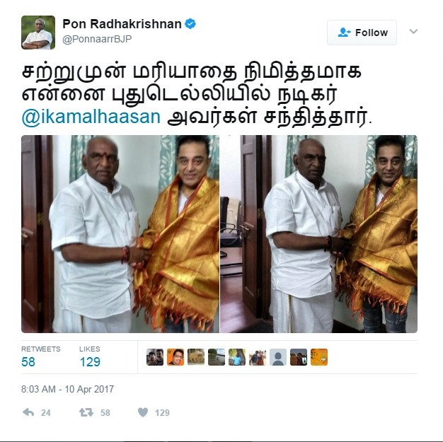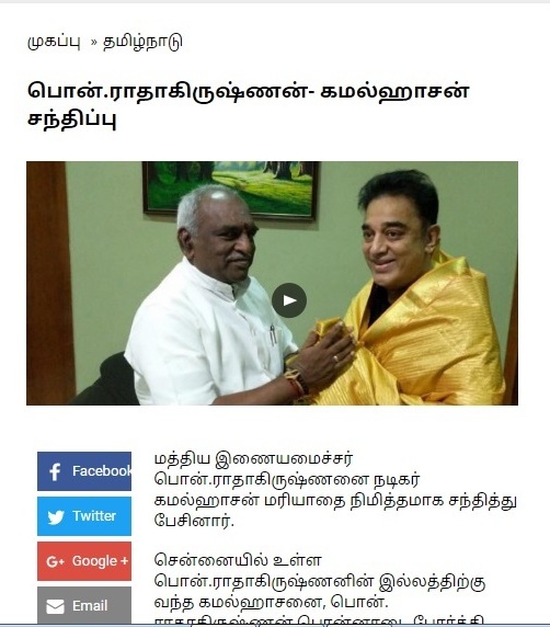 முன்பு விஸ்வரூபம் படம் வெளியிட முஸ்லீம் அமைப்புகள் பிரச்னை கிளம்பியதும் — தமிழக அரசு தடை விதித்ததும் — கமல் பல அறிக்கைகள் விட்டதும் — அப்போதைய முதல்வர் ஜெயலலிதா அவர்கள் அதற்கு ” தக்க விளக்கத்துடன் ” பதிலுரைத்ததும் — தங்களின் பார்வைக்காக : — // முஸ்லிம் அமைப்பினரோடு உடன்பாடு ஏற்படுத்துங்கள்: கமலுக்கு முதல்வர் யோசனை// http://www.dinamalar.com/news_detail.asp?id=637987 …. இந்த பொன்.ரா — கமல் அடிக்கடி சந்திப்பு ” பல காரணங்களுக்காக ” இருக்குமோ …. ?