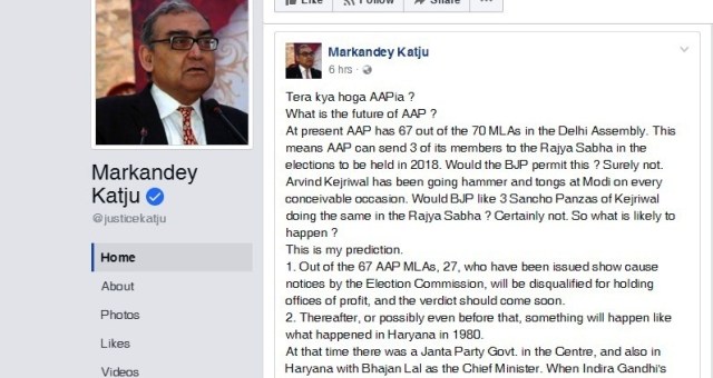 இந்த நிலையில் கட்ஜு தனது முகநூலில் ஒரு பதிவைப் போட்டுள்ளார். அதில் தேர்தல் ஆணையத்தின் உதவியுடன் பாஜக, ஆம் ஆத்மியை சிதைக்கவுள்ளதாக அவர் பரபரப்பாக கூறியுள்ளார். இதுதொடர்பாக கட்ஜு கூறியுள்ளதாவது: