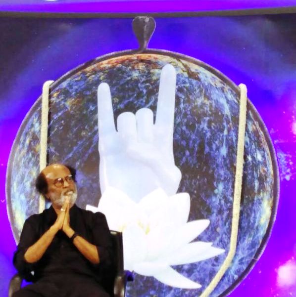 அவரது இருக்கைக்கு பின்னால் வைக்கப்பட்டிருக்கும் புதிய பேனர் – இரண்டு யூகங்களுக்கும் இடம் கொடுக்கிறது. (பாஜக சின்னத்திலிருந்து சற்றே வேறுபடும்) தாமரையும், அதனூடே “பாபா… முத்திரையும்” …!!!