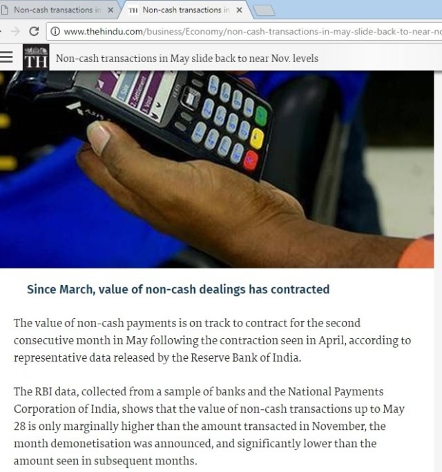 டிஜிடல் பரிவர்த்தனைகள் – கொஞ்சம் கொஞ்சமாக குறைந்து போய், மே 28-ந்தேதிய பரிசீலனையின்படி, கிட்டத்தட்ட பண மதிப்பீட்டு இழப்பு அறிவிக்கப்பட்ட நவம்பர் மாதத்திய அளவிற்கே சென்று விட்டதாம்…!!!