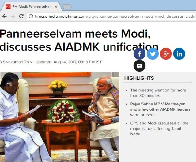 தற்போது ஓபிஎஸ் பிரதமரைப் பார்ப்பது சரியானதாகத் தோன்றவில்லை. ஓபிஎஸ் தலைவராகவேண்டுமானால், அதற்கு அதிமுக தொண்டர்கள்தான் ஆதரவு தரவேண்டும். தமிழக பிரச்சனைகளுக்கு இப்போது பிரதமரைப் பார்க்க என்ன அவசியம், ஓபிஎஸ் அவர்களுக்கு என்ன அதாரிட்டி? இது, பாகிஸ்தானில் உள்ள இந்துக்களின் நலனுக்காக, ‘இந்து மக்கள் முன்னணி’ பாகிஸ்தான் அதிகாரிகளைச் சந்திப்பதுபோன்றது. முதலில், இந்திய மக்களின் mandateஐப் பெறாமல் அங்கு செல்வதில் என்ன பயன் உண்டோ அதே பயன் ஓபிஎஸ், அதிமுக தொண்டர்களின் mandateஐப் பெறாமல், பிரதமரைச் சந்திப்பதில் உண்டு.