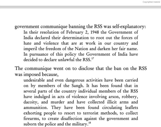 ”undesirable and even dangerous activities have been carried on by members of the Sangh. It has been found that in several parts of the country individual members of the RSS have idulged in acts of violence involving arson, robbery, dacoity, and murder and have collected illicit arms and ammunition. They have been found circulating leaflets exhorting people to resort to terrorist methods, to collect firearms, to create disaffection against the government and suborn the police and the military.”