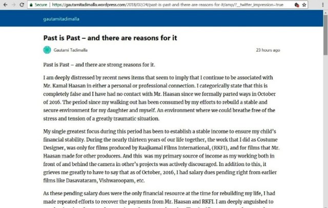 திருமதி கௌதமி தடமல்லா – தனது சமூக வலைத்தளத்தில், சில நிகழ்வுகளையும், அதனால் தனக்கு ஏற்பட்டுள்ள துயரங்களையும் மிகவும் நாகரிகமான முறையில் விவரித்திருக்கிறார் ….