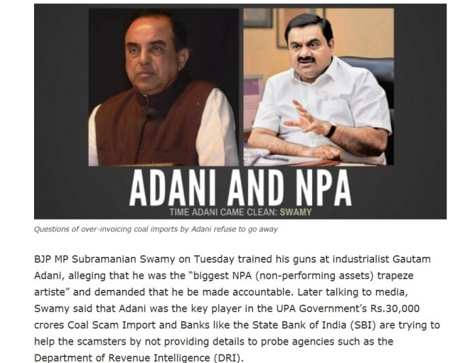 “வாராக் கடன்” பட்டியலில் முக்கிய இடத்தில் இருக்கும் குஜராத் தொழிலதிபரும், மோடிஜியின் நெருங்கிய நண்பருமான திருவாளர் அடானி மீது டாக்டர் சு.சுவாமி கடுமையான தாக்குதலை துவங்கி இருக்கிறார்.