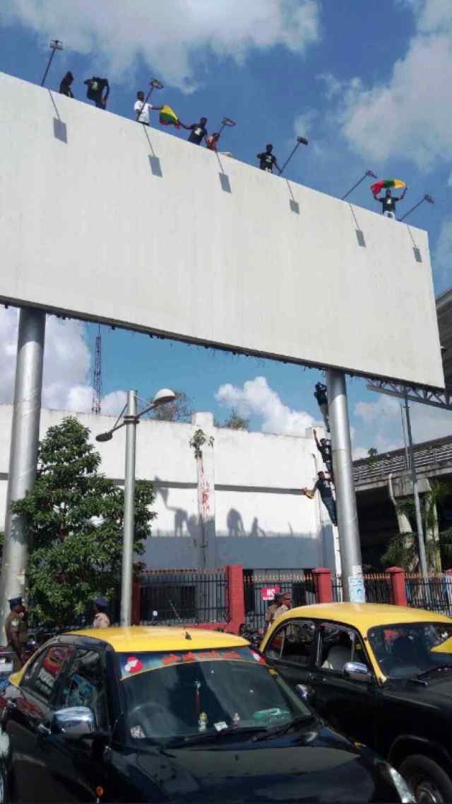 உயரமான பேனர்கள் மீது துணிந்து ஏறி எதிர்ப்பு காட்டியவர்கள்,