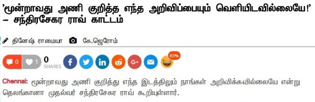 மற்றபடி சந்திரசேகர ராவ், தெலுங்கானாவின் கருணானிதி/திமுக அரசியல்வாதிதான். (இருவரும் பிரிவினை, மொழி வாதம் பேசி மக்களைப் பிரித்து ஓட்டு அறுவடை செய்பவர்கள்)