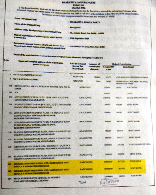 மேலே உள்ள ஆவணத்தின்படி, தூத்துக்குடி ஸ்டெர்லைட் நிறுவனம் பாஜகவுக்கு, தங்களது ICICI வங்கிக்கணக்கிலிருந்து, காசோலை எண் 837331 மூலம் 4 கோடி ரூபாயும், காசோலை எண் 837332 மூலம் மூன்றரை கோடி ரூபாயும், 2014 தேர்தலுக்கு சற்று முன்னதாக அளித்திருப்பது தெரிய வருகிறது…. ஆட்சிக்கு வரப்போகிறவர்கள் யார் என்பதை அவர்களால் முன் கூட்டியே மோப்பம் பிடிக்க முடியாதா என்ன…?