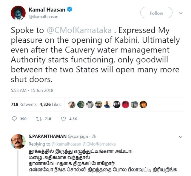 You are totally prejudice with Kamal. If the same statement comes from Rajini you would have dealt it in different manner. In his tweat he never said because he spoke to Karnataka CM the water was released. He mentioned that he spoke to him and thanked him. You always tries to portrait yourself as unbiased, but when it comes to Kamal, Stalin and few more your writing / comments are always biased. Not sure how many of your followers will abuse me for this, but still want to register my thoughts. Thanks