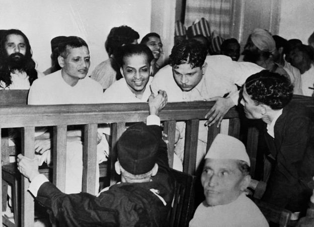 (புகைப்படத்தில், செங்கோட்டையில் அமைக்கப்பட்ட சிறப்பு நீதிமன்றத்தில் 1948 மே 27 அன்று நதுராம் விநாயக் கோட்ஸே, நாராயண் ஆப்தே, விஷ்ணு ராமகிருஷ்ண கர்கரே ஆகியோர் )