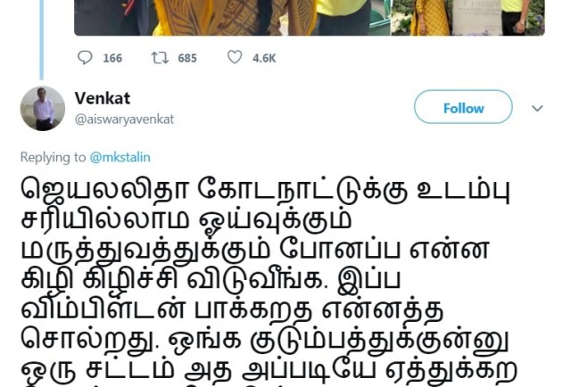 ஜெ.அவர்கள் உடல்நலக்குறைவு காரணமாக கொடநாட்டில் தங்கி இருந்ததை, இவர் எந்த அளவிற்கு கொச்சைப்படுத்தினார் என்பதை மக்கள் இன்னும் மறக்கவில்லை என்பதைத்தான் மேற்கண்ட கமெண்ட் தெரிவிக்கிறது….