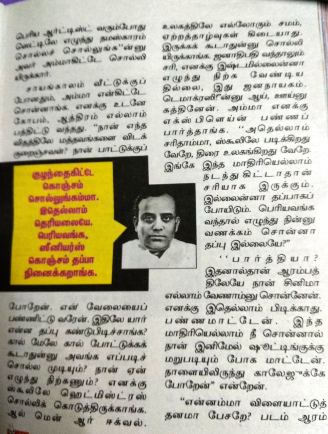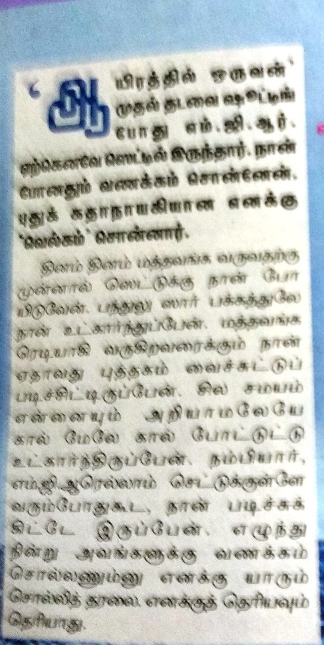 இங்கு எழுதுபவர்கள் எல்லோரும், ஏதோ எம்ஜியாரும் ஜெ.வும் மற்றவர்களை மரியாதை கொடுக்கும்படி வற்புறுத்தியதுபோல் சொல்கிறார்கள். பொதுவா இந்த மாதிரி விஷயங்களை ஆரம்பிப்பது ‘அல்லக்கைகள்’. அவங்கதான் ‘ஒட்டுவாரொட்டி’யாக இருந்து தங்களுக்குத் திறமையில்லாமல், அடுத்தவர்களை அண்டிப்பிழைப்பவர்கள். இப்படி பில்டப் கொடுத்து, சாதாரணமாக இருப்பவர்களையும், ‘வேண்டுமென்றே மரியாதை கொடுக்கவில்லை’ என்று போட்டுக்கொடுத்து பிரச்சனையை உண்டாக்குபவர்கள். அதனால் படப்பிடிப்பும் தாமதப்படலாம் இல்லை நிறுத்தப்படலாம். இந்த விஷயங்களில் பல அந்த அந்த கதாநாயகர்களுக்கே தெரியாது.