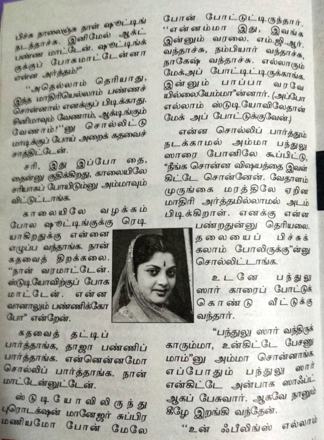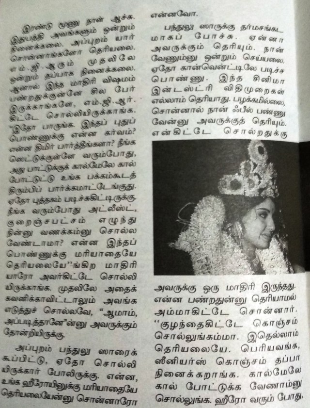 ஜெ. அவருடைய தாயாரை மிகவும் சார்ந்திருந்தார். இந்தத் தொடர் ஒரு சமயத்தில் எம்.ஜி.ஆரால் நிறுத்தப்பட்டது (எங்கே விவகாரமான விஷயங்களையும் சொல்லுவாரோ என்று)
