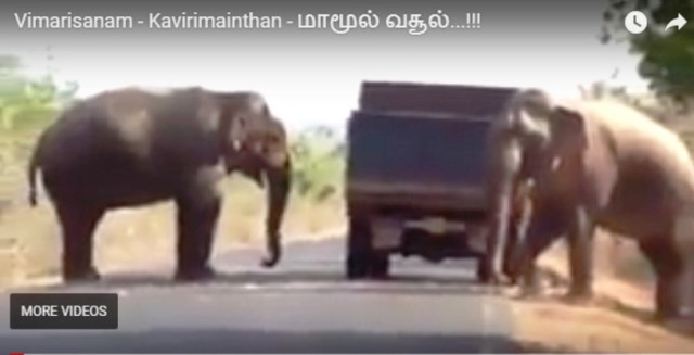 இங்கே யானைகள் அடாவடியாக வழிமறிப்பதையும்,
