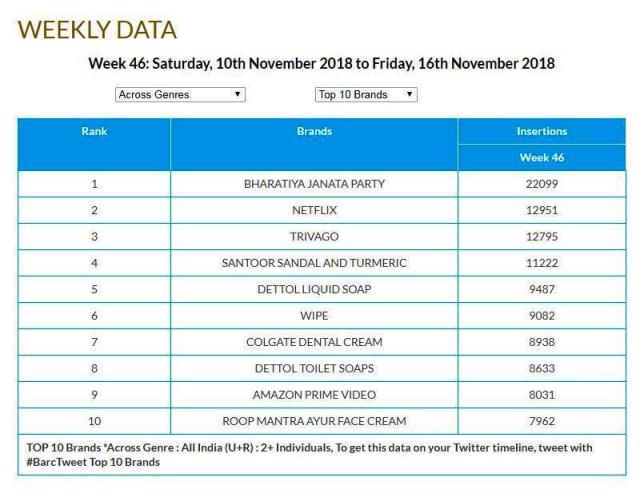 ப்ராட்காஸ்ட் ஆடியன்ஸ் ரிசர்ச் கவுன்சில் (BARC) வெளியிட்டுள்ள
