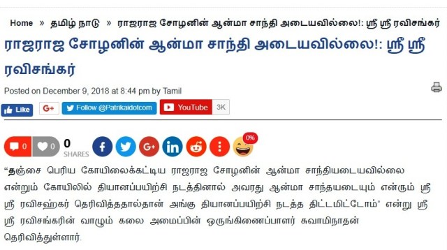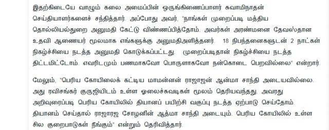 தஞ்சை பெரிய கோயிலில் இவர்கள் எதற்காக நிகழ்ச்சி நடத்த விரும்பினார்கள் என்று ஸ்ரீ ஸ்ரீ ரவிசங்கர்ஜியின் ஒருங்கிணைப்பாளர் சொல்வதை கீழே பாருங்கள்….