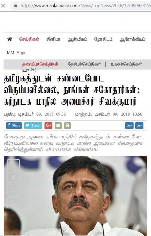 It is a ploy by stalin that he will discuss Mekadatu issue with Cong highcommand. People know DMK very well. that it is the most opportunic party and the alliance with Congress is to win more MP seats and if by chance cong comes back to power DMK will certainly bypass Mekadatu issue , and will try to secure PLUM portfolios of ministries at center to add more money to its already swollen coffers.
