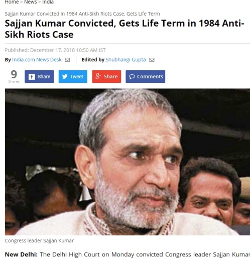 1984-ல் திருமதி.இந்திரா காந்தி கொலையுண்டதை அடுத்து டெல்லியில் நடந்த கலவரங்களில் தொடர்புடைய சஜ்ஜன் குமார் என்கிற டெல்லியைச் சேர்ந்த முன்னாள் காங்கிரஸ் தலைவருக்கு,