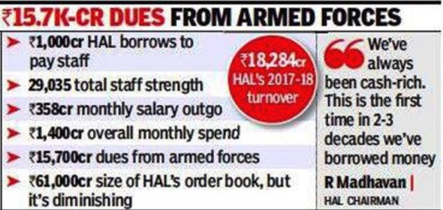 TOI reported on October 10, 2018 that HAL’s cash reserves were about Rs 1,000 crore, just enough to pay its 29,000 employees for three months. Defence PSU Hindustan Aeronautics Limited (HAL), grappling with low finances has been, for the first time in many years, forced to borrow money to pay salaries to its employees. The company is worried of work coming to a standstill from April