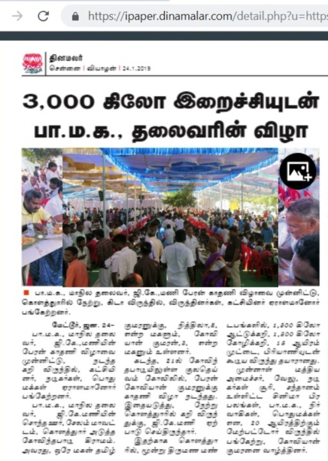 3000 கிலோ இறைச்சியுடன், சுமார் 20,000 நபர்களுக்கு, 3 திருமண மண்டபங்களில் விருந்து நடந்ததாக புகைப்படத்துடன் செய்தி கூறுகிறது.