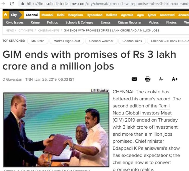 முழு சுதந்திரமும், அரசியல் தலையீடு இல்லாத சூழ்நிலையும் இருந்தால், தமிழகத்தைச் சேர்ந்த பல IAS அதிகாரிகள் எவ்வளவு சிறப்பாக பணியாற்றக்கூடிய திறமையுடையவர்கள் என்பதை நடந்து முடிந்த உலக முதலீட்டாளர் மாநாடு (Global Investor’s Meet) நிரூபித்துக் காட்டியுள்ளது.