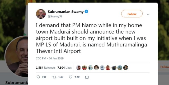 ஞாயிறு அன்று, மோடிஜி மதுரைக்கு விஜயம் செய்ததையொட்டி, டாக்டர் சு.சுவாமி, தனது ட்விட்டர் மூலமாக ஒரு மிரட்டல் அறிவிப்பு விடுத்திருந்தார்…