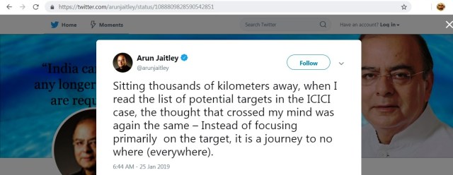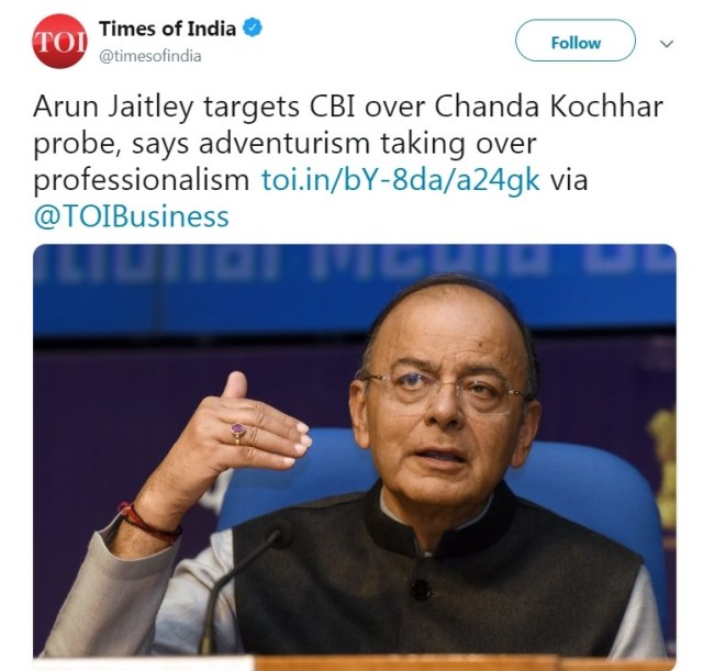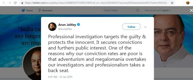 பொதுவெளியில் இப்படி எழுதுகிறோமே – இது குறித்து விமரிசனம் வருமே என்று கூட யோசிக்காமல், திரு.ஜெட்லி துடித்துப்போய் சிபிஐ பற்றி, நிறைய comments போட்டு, ட்விட்டர் செய்திகள் வெளியிடுகிறார்…கீழே அவற்றை பார்க்கலாம்.