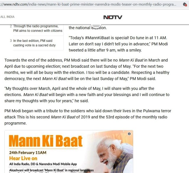 சிந்தனைகளை தேர்தல்கள் முடிந்த பிறகு மே மாதக் கடைசி ஞாயிறு அன்று நடக்கவிருக்கும் “மன் கி பாத்” நிகழ்ச்சியில் பகிர்ந்து கொள்வதாகவும் கூறி இருக்கிறார்.