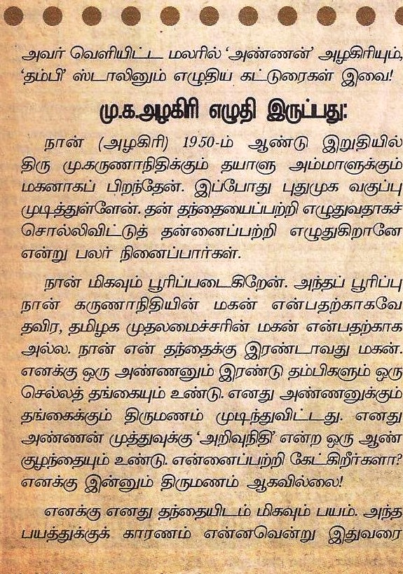 வளர்ந்த, முதிர்ந்த, 60 வயதைக்கடந்த அஞ்சாநெஞ்சன் அழகிரியை நமக்கு நன்றாகவே தெரியும். அவரது இன்றைய குணாதிசயங்களைப் பற்றியும் தெரியும்.