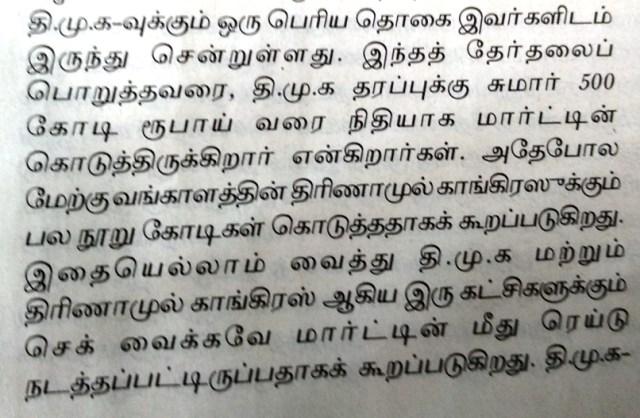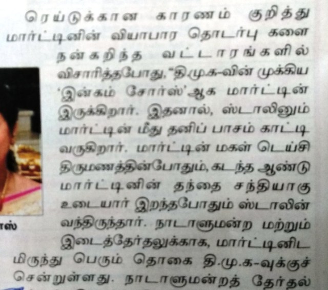 1. Two issues one is Martin has donated funds to DMK & TMC in this election..2. Just because both DMK & TMC against the BJP ,, BJP sent the IT to raid Martin… 3. If we are wise enough we will accept the fact every political party will get money from any one irrespective of whether the donor is a good or bad person .( naai vitha kaasu kuraikkathu)