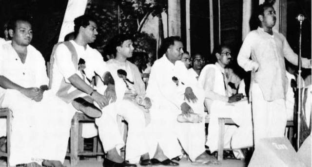 துவக்க கால செயல்வீரர்கள் – மதியழகன், நெடுஞ்செழியன், கருணாநிதி, என்.வி.நடராசன் ஆகியோருடன் சி.என்.அண்ணாதுரை….(பேசிக்கொண்டிருக்கிறார்…)