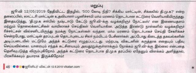 // இந்த விகடன் தற்போது இந்த செய்தியை வெளிட்டு இருப்பதற்கு என்ன காரணம் .. ? மார்ட்டினின் ஃப்யூச்சர் கேமிங் நிறுவனத்தில் காசாளராகப் பணிபுரிந்து வந்த பழனிச்சாமியின் இறப்பு என்பது மட்டும் காரணமாக கொள்ள முடியுமா என்பதே கேள்வி — ? பழனிச்சாமியின் மனைவி இரண்டு கோடிகள் வரை பேரம் பேசுகிறார்கள் என்று வெளிப்படையாக கூறி வருகிறார் — எது எப்படியோ 500 கோடிகளை தேர்தல் நன்கொடை — “எலெக்டோரல் பாண்ட்” மூலம் கொடுத்ததா …? // …. இது நீங்கள் குறிப்பிட்டுள்ள முந்தைய இடுகையில் எமது பின்னூட்டத்தில் ஒரு பகுதி … இன்று விகடன் மறுப்பு செய்திக்கு ஆதாரமாக பழனிச்சாமியின் மர்ம மரணத்தை பற்றிய விசாரிப்பை காட்டியுள்ளது … இந்த பத்திரிக்கை அவர்களின் குடும்பத்தை சேர்ந்தவர்களினுடையது தானே — அந்தர் பல்டி அடிக்க கற்று கொடுக்கவாவேண்டும் — ?
