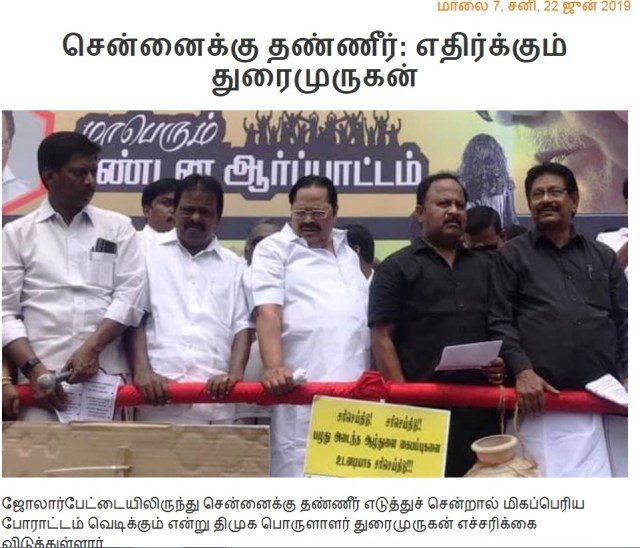 Water Managementக்கு முக்கியக் காரணம் கருணாநிதிதான். அவர்தான் ஓட்டுக்காகவும், தங்கள் கட்சிக்காரங்க மற்றும் தன் குடும்பம் பயன் பெறணும் என்று ஏரிகளைத் தூர்த்து அதில் வீடுகள் கோட்டங்கள் அமைத்தவர். இரண்டாவது அடையாறு ஆற்றின் கரை ஆக்கிரமிப்புக்கு முக்கிய காரணகர்த்தா (வாக்குகள் என்ற போர்வையில்). எப்போது எப்போது ஆற்றின் கரை ஆக்கிரமிப்புகளையோ இல்லை ஏரி ஆக்கிரமிப்புகளையோ அகற்ற அதிமுக அரசு முயல்கிறதோ அப்போது போராட்டத்தைத் தூண்டிவிட்டவர். அதனால் அதிமுக அரசும் ‘எக்கேடு கெட்டுப்போ’ என்று விட்டுவிட்டது. துரைமுருகன் திமுகவில் ஊறியவரல்லவா? அதனால் போராட்டத்தைத் தூண்டி எந்த நல்லதையும் செய்யவிடமாட்டார்.