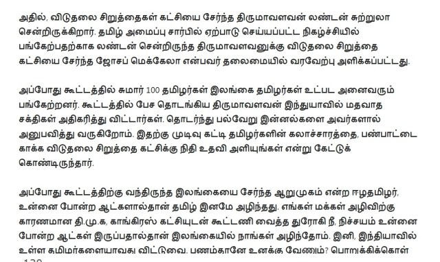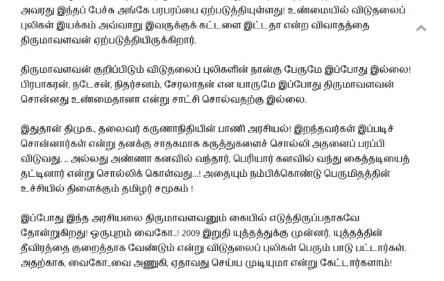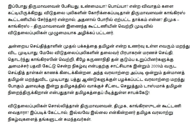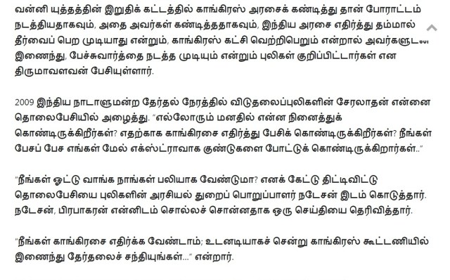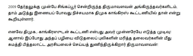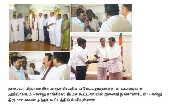 நீங்கதான் திருமாவளவனுக்கு ஒரு இமேஜ் இருக்கறதாச் சொல்றீங்க (என்ன இமேஜ் என்று நீங்களும் சொல்லலை). அவர் விடுதலைப் புலிகளிடம் தன் இயக்கத்துக்கு காசு கேட்டார், அவங்க போனதும் ராஜபக்ஷேவிடம் காசு கேட்டார், அப்புறம் ஈழத் தமிழர்களிடம் காசு கேட்கிறார். திருமாவளவன்லாம் நம்பிக்கைக்குரியவரே கிடையாது. அவர் எந்தக் கட்சிக்கும் எந்தக் காலத்திலும் விசுவாசமாக இருந்தது கிடையாது. ஈழத் தமிழர்களிடம் ஒன்றும், இஸ்லாமியர்களிடம் ஒன்றும், தன் இன மக்களிடம் ஒன்றும் என்று பார்க்கும் இடமெல்லாம் கூசாமல் பொய் சொல்லி காசு தேத்தக்கூடியவர் ‘கட்டப்பஞ்சாயத்து’க்குப் பெயர் பெற்ற திருமாவளவன்.