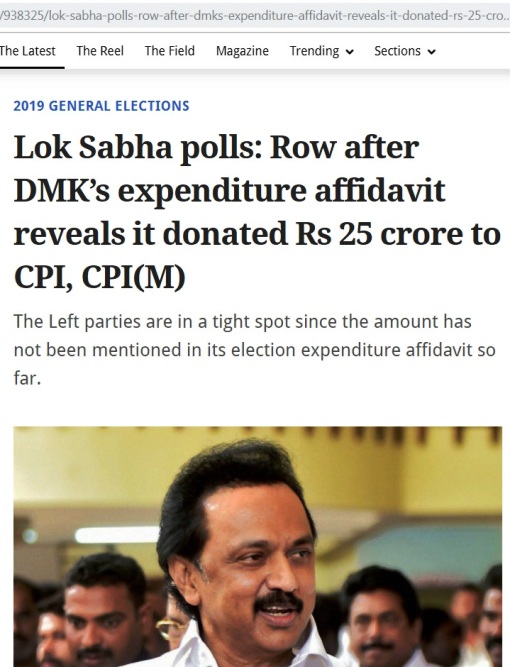வலது கம்யூனிஸ்ட் கட்சிக்கு -10 கோடி. // என்பதை தான் ” இடது — வலது கம்யூனிஸ்ட்கள் பெற்ற தொகையை சரிபார்க்கவும் — மாறியுள்ளது …! ” என்று குறிப்பிட்டு இருந்தேன் …சரி செய்யவும் …! // The Hindu reported on Tuesday. Of this amount, Rs 15 crore was given to the Communist Party of India and Rs 10 crore to the Communist Party of India (Marxist). //