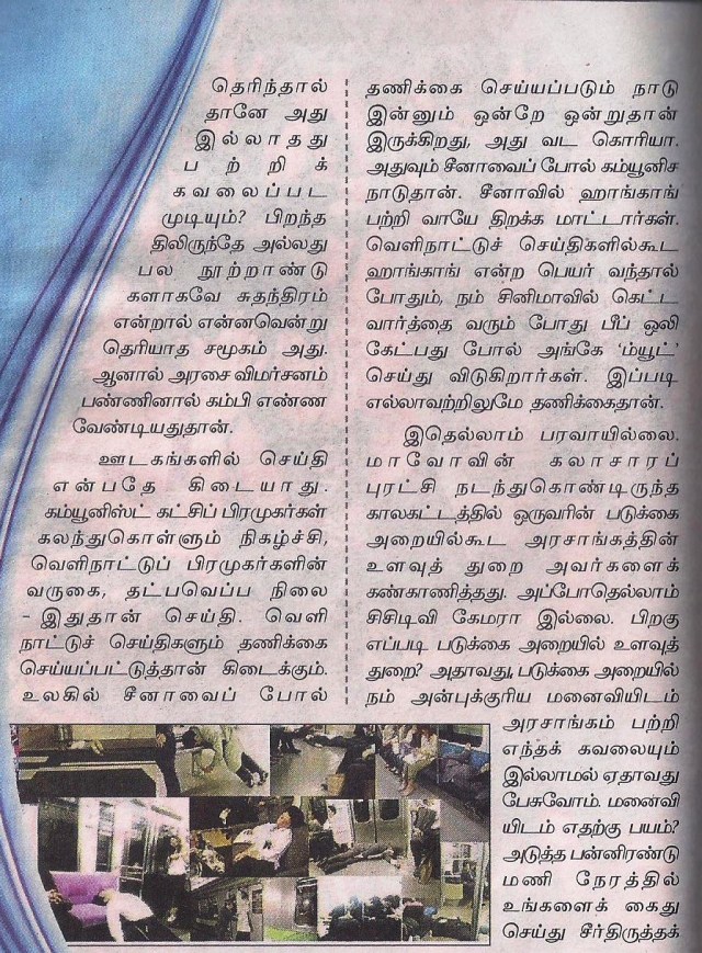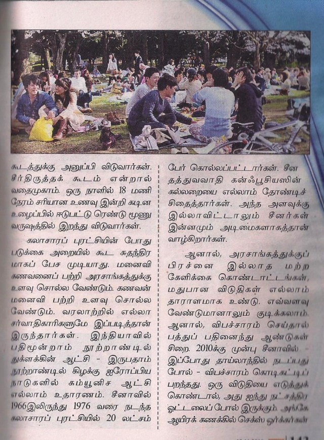 //படுக்கை அறையில் கணவன் பேசுவதை, மனைவி அரசுக்கு உளவு சொல்ல வேண்டும்-இது கலாச்சாரப் புரட்சியின்போது என்று சொல்லியிருக்கிறார்// – ஒவ்வொரு உயிரும் அரசுக்கு மட்டுமே விசுவாசமாக இருக்கவேண்டும் என்ற கொள்கையை மக்களின் மனதில் விளைத்து அதை நடைமுறைப்படுத்தியது சோவியத் யூனியன். அரசை அப்பா வீட்டில் குறை சொன்னால் பையன் கம்யூனிஸ்ட் கட்சிக்குத் தெரிவித்து விசுவாசமாக இருப்பது, அதுபோலவே மனைவி – இது அங்கு சகஜமாக இருந்தது. அப்படிப்பட்ட பையனை, ஸ்பெஷல் பள்ளியில் சேர்த்து அரசு படிக்கவைக்கும், பிற்காலத்தில் அவனும் கம்யூனிஸ்ட் கட்சியில் முன்னேறுவான். இதைப்பற்றி நிறைய நான் படித்திருக்கிறேன் (அனுபவங்கள் புத்தகத்திலும்). ஆனால் சைனாவைப் பற்றி இவ்வாறு நான் கேள்விப்பட்டதில்லை. இதில் உண்மை இருக்க-அவர் கொஞ்சம் அதீதமாக படுக்கை அறை என்றெல்லாம் எழுதியிருக்கிறார், குமுதம் படம் போட வாய்ப்பிற்காக – வாய்ப்பு நிறையவே உண்டு. ‘அரசுக்கு விசுவாசம்’ என்பதைக் காண்பித்து கம்யூனிஸ்ட் கட்சியில் உறுப்பினராவது, உயர்வது சகஜமே.