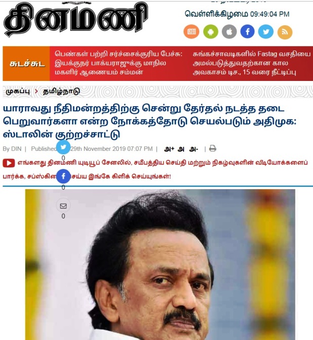 ஏற்கனவே இடைத்தேர்தலில் சொந்தத் தொகுதிகளை இழந்த வருத்தம், இலவு காத்த கிளியாக இத்தனை காலம் காத்திருக்கவேண்டியிருக்கிறதே என்ற ஏக்கம், ஆளும் கட்சியாக அதிமுக இருப்பதால் உள்ளாட்சித் தேர்தலில் கணிசமான அறுவடை நடத்தினால், காங்கிரஸ் மற்றும் துணைக் கட்சிகள் தன்னிடம் நிறைய டிமாண்ட் வைக்குமே, பலவீனமாக சட்டசபைத் தேர்தலைச் சந்திக்க நேரிடுமே, அப்படி ஒரு நிலை வரும்போது வாக்களிக்க மனதில் நினைத்திருப்பவர்களும் வாக்களிக்க யோசிப்பார்களே என்பதனால்தான், தன் அல்லக்கைகளை வைத்துக்கொண்டு வழக்கு தொடுத்திருக்கிறார். அதற்கான சப்பைக்கட்டு தான் அவர் வெளியிட்டிருக்கும் குற்றச்சாட்டு. பாவம் ஸ்டாலின்….. பெரிய ஆலமரத்தின் நிழலில் எதுவும் வளராது என்பதை மீண்டும் நிரூபித்திருக்கிறார் அவர்.