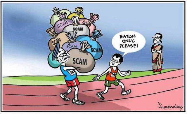 Baton only please – இந்த கார்ட்டூந்தான் என் மனதைக் கவர்ந்தது. ராகுல் காந்தி, மன்மோகன் சிங் செய்த எல்லாவற்றிர்க்கும் பொறுப்பு ஏற்கவேண்டிய நிலைமை. அதனால்தான் அவரது வளர்ச்சி ரொம்பவும் தடைபடுகிறது என்று நினைக்கிறேன். காங்கிரஸ், அவர் தலைமையில் வளர்ச்சியுற வேண்டும் (மைனஸ் பிரியங்கா கும்பல்)