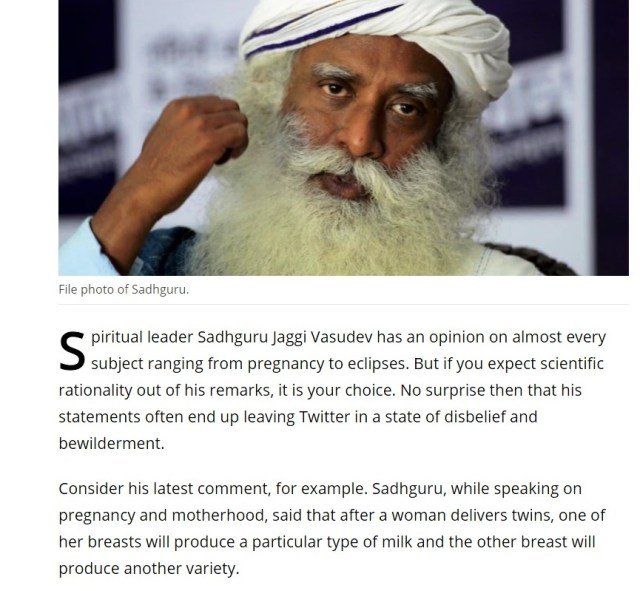 அண்ணா ,இவர்கள் எல்லாம் ஒரு மனிதர்கள் என்று இவர் கருத்துக்களை பற்றி பேசுவதே அபத்தம்.ஆனாலும் லட்ச கணக்கான மக்கள் இவரை ஏற்று கொள்வதற்கான காரணம் வெளியில் சொல்ல முடியாது.யார் வேண்டுமானாலும் சத்குரு ஆகலாம் .என்ன வேண்டுமானாலும் செய்யலாம் என்ற கேவலமான நிலையில் நம் நாடு இருக்கிறது.வேதனை
